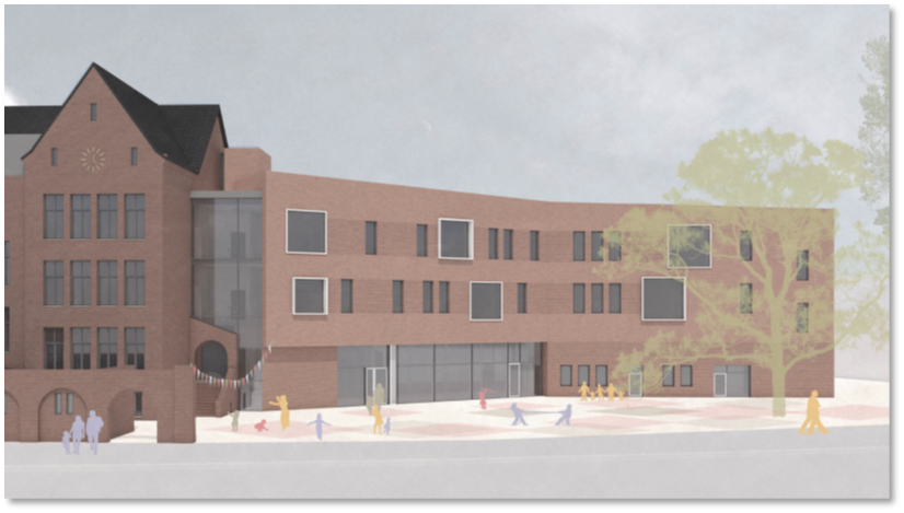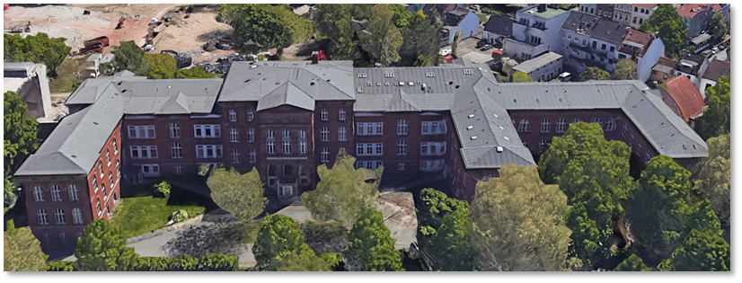 Das bestehende Gebäude wurde 1888 als ein Chirurgisches Krankenhaus gebaut und 1907 um einen Flügel erweitert. Das Gebäude steht unter Denkmalschutz und umfasst heute ca. 8.800 m² BGF. Integriert werden Schule und Kindertagesstätte für ca. 600 Personen mit Mensen und zugehörigen Küchen. Aus hygienischen, energetischen und auch schallschutztechnischen Gründen werden sechs RLT-Anlagen mit zusammen ca. 50.000 m³/h Luftmenge installiert.